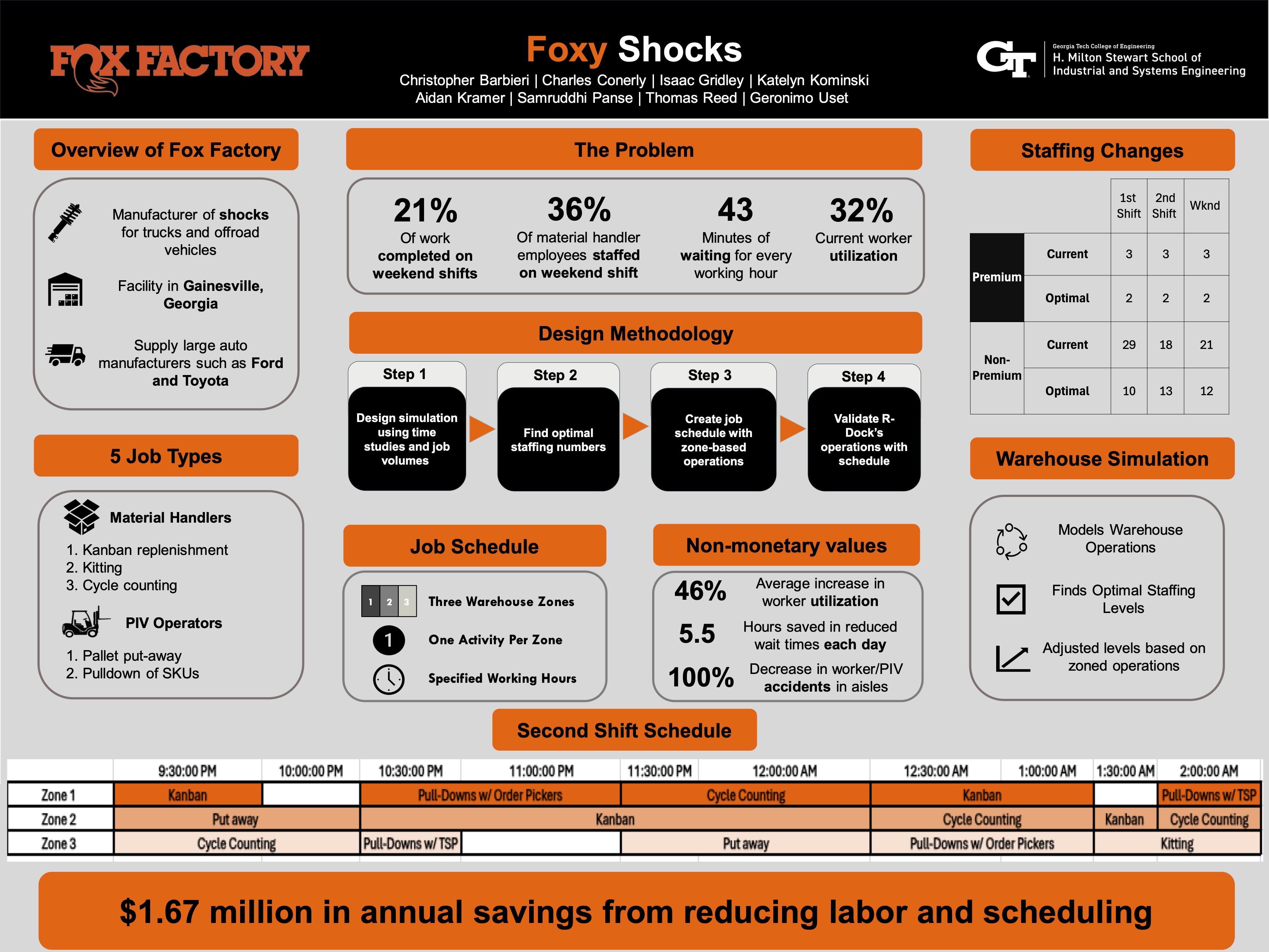 Fox Factory is a global leader in the design and development of shocks for high performance vehicles. Their facility in Gainesville, GA, has grown tremendously since its start in 2020. With this growth, they have faced storage and space constraints within the facility, causing them to combine their two receiving docks into one while using the other for additional storage space. Additionally, Fox Factory has hired more warehouse workers to keep up with the demand but are now observing extended periods of time in which employees are idle with little work to complete.