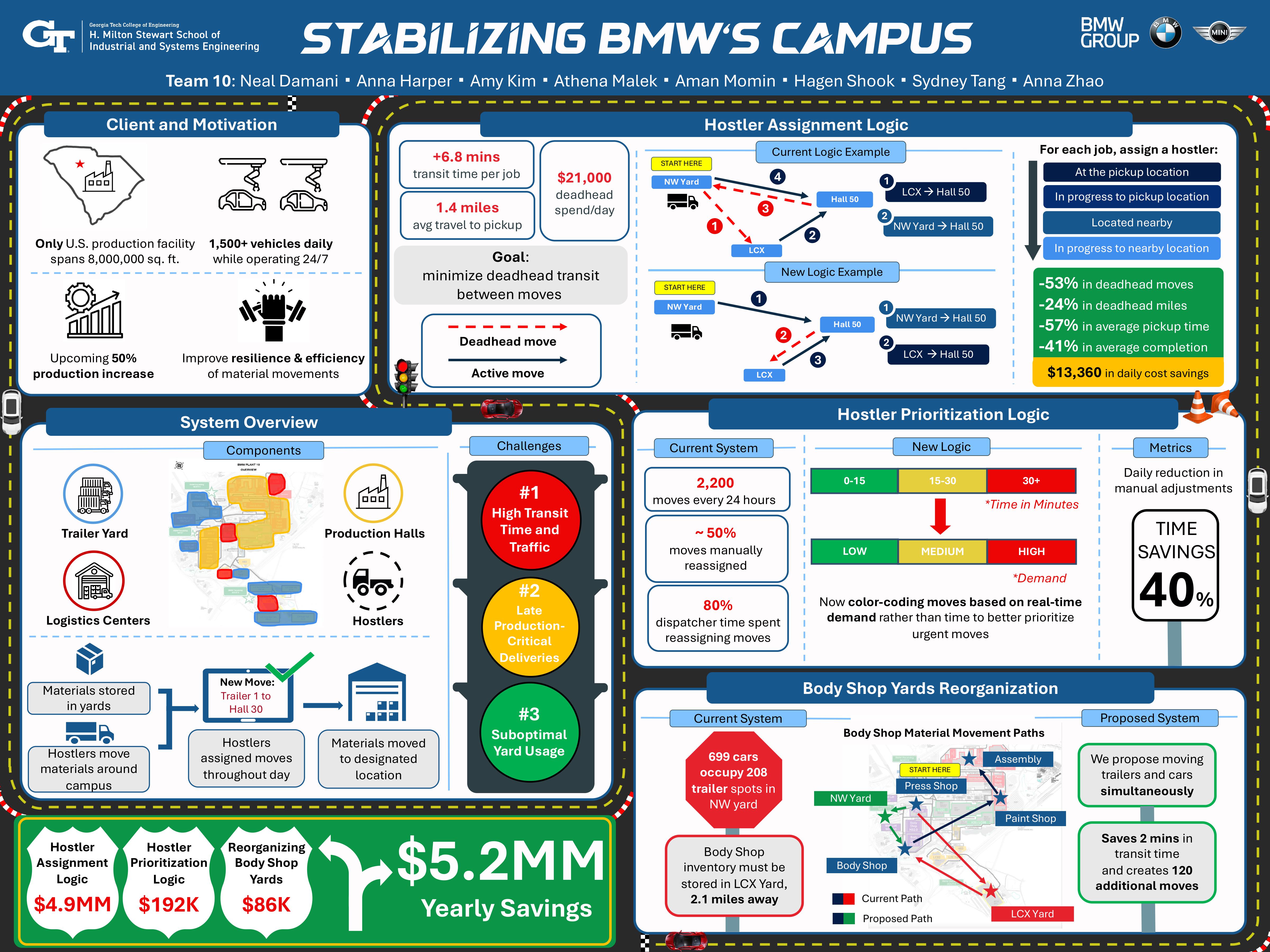 With deliverable one’s reduction in deadhead miles, truck driver fleet size, and both direct and indirect operational efficiencies, it contributes to $13.3K of daily cost savings—approximately $4.9 million annually. The second deliverable results in yearly cost reductions of $192K from dispatcher time savings. Finally, the yard reorganization results in daily savings of $236 in fuel alone. Across these three deliverables, the savings total $5.2 million annually. Beyond financial gain, our solutions ensure that BMW is prepared for its 50% production volume increase and that the Spartanburg, SC campus remains resilient.