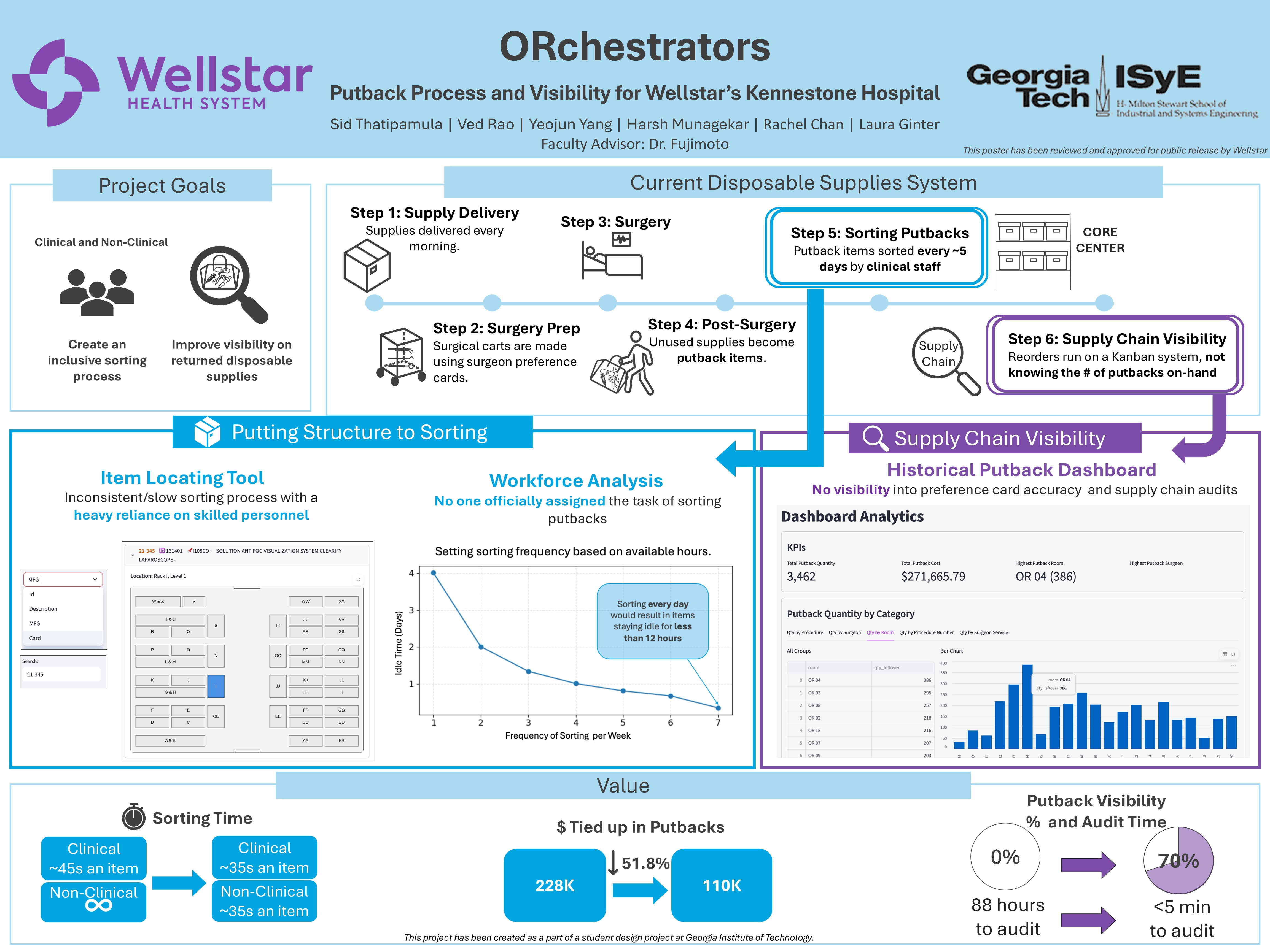 The objective of this project is to improve the efficiency, visibility, and financial performance of the PeriOperative Services supply chain at Wellstar Kennestone Hospital by addressing major breakdowns in the surgical supply putback process. Currently, unused disposable items after surgery, putbacks, remain in unsorted piles across the inventory room for days due to lack of visibility, inconsistent sorting practices, and limited staff familiarity with supply locations to resort these items. These inefficiencies lead to unnecessary reordering, prolonged idle stock, and unorganized inventory storage for clinical staff. This project aims to develop workforce strategies and digital tools that reduce idle inventory time, standardize sorting processes, and expand the pool of staff who can meaningfully participate in putback sorting.
